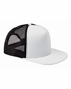 "100% polyester front panel, mesh back panels; 5-panel; front panel with foam backing; plastic closure;"
