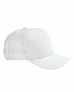 "100% cotton twill front panels, mesh back panels; 5-panel; two front twill panels with foam backing; plastic closure;"