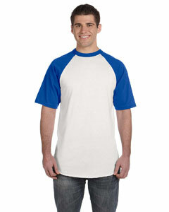 "50% cotton, 50% polyester jersey knit; 1x1 rib knit collar; contrast color raglan sleeves ; double-needle hemmed sleeves; serged fishtail bottom; additional colors available by special order;"