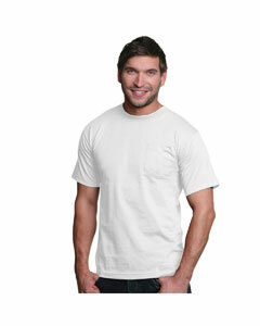 "5.4 oz., 100% preshrunk premium open-end cotton pocket t-shirt; Dark Ash color is 90% cotton, 10% polyester; Full cut for comfort; Rib knit collar; Taped shoulder to shoulder; Left chest five point pocket; Double-needle stitched sleeve and bottom hem;"