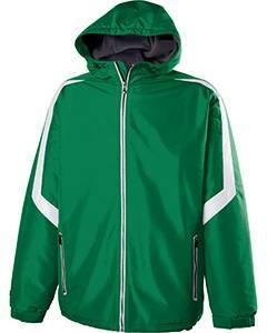 100% polyester; Drop tail hem; Front zippered pockets in a contrasting color; Adjustable cuffs; Quilted nylon sleeve;