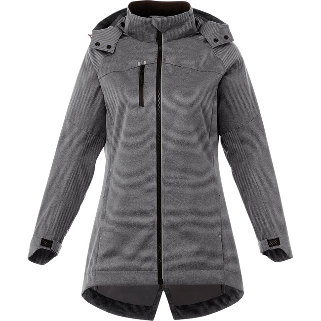 The Bergamo Softshell Jacket in women's sizes has a refined look that's ideal for a corporate setting. The three-layer, bonded fabric, waterproof membrane and critical seam sealing keep you dry and comfortable when the weather won't cooperate. This jacket also has an innovative new sleeve closure, a detachable snap off hood with adjustability, articulated elbows and ergonomic sleeves for ease of movement. The women's style has a longer length, shaped seams and tapered waist for a flattering fit.