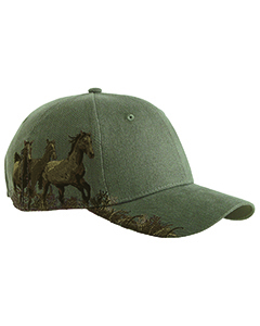 100% brushed cotton twill; Structured front; Pre-curved visor; Hook and Loop backstrap; Detailed embroidered wildlife scene on right side; Dri Duck embossed leather patch left of back vent; Imported; Minimum Order Quantity: 24pc/style/color