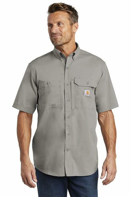 This sweat-busting stain-fighting shirt will also keep you cool as a cucumber. 3-ounce 60/40 poly/cotton sheeting FastDry technology wicks away sweat Stain Breaker technology releases stains Double-layer collar converts to stand-up collar for extra sun protection Mesh-lined vent at center back for flow-through ventilation Four chest pockets: Left has buttoned-flap pocket with an oversized concealed zippered mesh-lined vertical pocket; Right has two easy-entry pockets: one with button closure one with hook and loop closure Contrast color neck piping Carhartt label sewn on left chest pocket Carhartt Force labeling on inner back neck Relaxed fit
