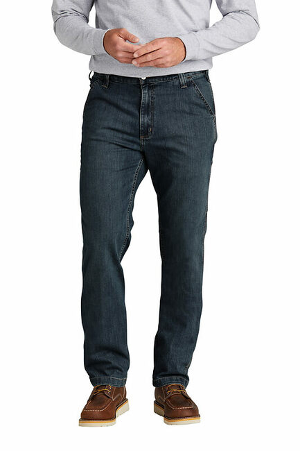 Built in a relaxed fit with Rugged Flex technology these jeans are made of abrasion-resistant denim for long-lasting durability. Multiple pockets give you plenty of storage for your tools.12-ounce 85/14/1 cotton/poly/spandex denimRugged Flex durable stretch technology for ease of movementSits slightly below the waistComfortable fit through the seat and thigh with more room to moveStronger sewn-on seam belt loopsStraight leg opening fits over bootsMultiple tool and utility pocketsCarhartt label sewn on right rear pocketRelaxed fit