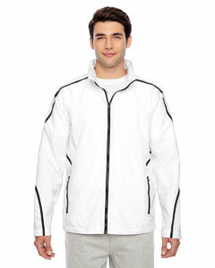 "2.8 oz., abrasion-resistant 100% nylon taslan shell with polyurethane coating for enhanced wind- and water-resistance; 2.95 oz., 100% polyester dyed-to-match tricot big hole mesh lining in body; 1.7 oz., 100% polyester taffeta lining in sleeves; roll-away three-piece hood with 1¼"" rain bill; Black 3/8"" taping adds contrast to back and sleeves; EZEM zipper in back lining for easy decoration access; center front/lower pockets with molded plastic zipper with garage;"