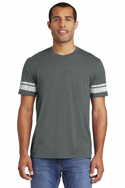 This tee has a retro game-day inspired look. 4.5-ounce 60/40 ring spun combed cotton/poly 32 singles 1x1 rib knit neck Tear-away label Distressed printed stripes at sleeve Front and back yoke Shoulder to shoulder tapingPlease note: This product is transitioning from woven labels to tear-away labels. Your order may contain a combination of both labels.