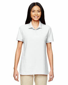 "65% polyester, 35% preshrunk cotton double piqué; DryBlend® technology delivers moisture-wicking propertiess; clean finished reversed placket with reinforced bottom box; contoured welt collar; sideseamed ; heat transfer label; double-needle bottom hem; missy contoured silhouette; two dyed-to match buttons* welt cuffs* side vents;"