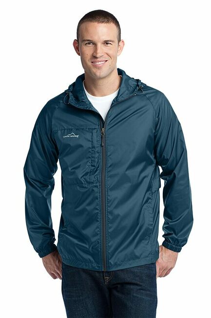 Wind was the inspiration for this compact layer. Plus it packs down into a pocket making it easy to carry wherever you go. Hood with locking drawcords for adjustability contrast reverse coil zipper underarm vents packable zippered chest pocket front unzippered pockets elastic cuffs and an open hem. Contrast Eddie Bauer logo on right chest. Made of 100% nylon.