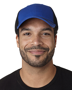 100% washed cotton twill front panels and visor; 100% polyester soft mesh back panels; Structured; Mid-profile; 6-panel; Self-adhesive closure; Matching top button and sewn eyelets; Contrast stitching on visor and self-fabric sweatband;