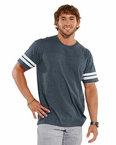 4.5 oz. 60/40 combed ringspun cotton/polyester vintage heathered fine jersey; Vintage Heather 54/40/6 cotton/polyester/viscose; Taped shoulder-to-shoulder with EasyTearTM label; Coverstitch front and back yoke; Contrast stripes on sleeves; Double-needle hem sleeves and bottom;