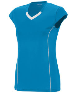 100% polyester wicking smooth knit; Odor-resistant; Wicks moisture away from the body; Girls' fit; Set-in cap sleeves; Self-fabric V-neck color collar with contrast color detail; Contrast color stitching on princess seams;