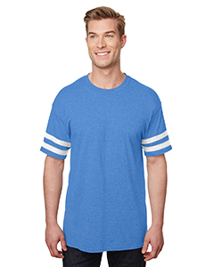 5.3 oz/yd, 100% cotton; 50% cotton, 50% polyster: Heather Red/White, Heather Maroon/White, Heather Navy/White, Heather Royal/White, Graphite Heather/Black; Ash Grey is 99% cotton, 1% polyester/Graphite Heather (sleeve stripes) 50% cotton, 50% polyester; White is 100% cotton/Graphite Heather (sleeve stripes) 50% cotton, 50% polyester; Taped neck and shoulders; Tear away label; Contrast self-fabric sleeve stripes; Double needle sleeve and bottom hems ; Quarter-turned to eliminate center crease; Seamless double needle 7/8 collar
