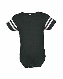 4.5 oz. 60/40 combed ringspun cotton/polyester vintage heathered fine jersey ; Vintage Heather 54/40/6 cotton/polyester/viscose; Taped neck with EasyTearTM label; Coverstitch front and back yoke; Contrast stripes on sleeves; Double-needle hem sleeves; Double-needle ribbed binding on leg opening; Reinforced three snap closure;