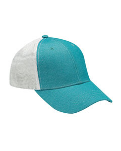 80% polyester, 17% cotton, 3% spandex shimmer effect heather; 6-panel, structured, two-tone, mid profile crown ; Contrast color heather front panels and top of visor, white soft mesh back panels; Black nylon stretch sweatband, matching color eylelets and pre-curved visor; Seam tape matching visor color, top button matches front panels; Self fabric heather Velcro® closure;