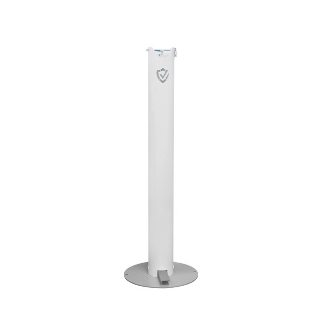 SOLD BLANK.  Pedal activated sanitizer station – simple & easy to use.  No contact with hands.  100% mechanical – no batteries.  Universal bottle fit from 8oz to 32oz.  Rust proof durable powder coated aluminum with steel base.  Other color options may be available, please contact us.  Optional customizable sign (additional cost applies) – Customize with logo, welcome message or use instructions.