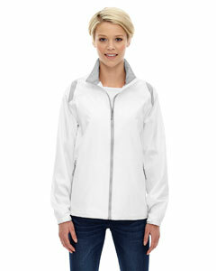 "100% polyester 240T pongee, 2.3 oz./yd2/78 gsm; water resistant finish; inside storm placket with chin guard; reflective stripe on center front zipper tape; contrast reverse coil zippered pockets ; reflective stitching on external locker loop at back neck; adjustable cuffs with tabs; drop back hem with adjustable shockcord;"