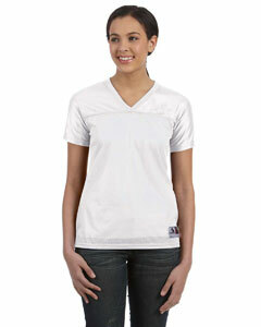 100% polyester tricot mesh with 100% polyester dazzle fabric yoke and sleeves; junior fit – not meant to be worn with pads; 1x1 rib knit modified V-neck collar ; front and back yokes large enough for embellishment; outside locker label on wearer's left side near bottom hem ; double-needle hemmed sleeves and bottom; set-in sleeves; finished side vents look good untucked;