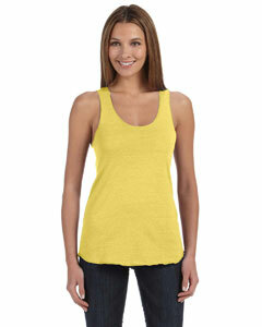 "20's 50% polyester (6.25% recycled), 38% cotton (6.25% organic), 12% rayon; 4.4 oz.; ladies' comtemporary fit; low-impact yarn-dyed and fabric-washed; racerback; merrowed hem ; rounded bottom;"