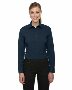 100% polyester mechanical stretch two-tone melange; 2.9 oz./yd2/97 gsm with moisture wicking performance; two-tone mélange fabric; hidden button-down collar; back yoke with side pleats; double-needle flat felled side and underarm seams; tailored adjustable cuffs with buttoned sleeve plackets; front and back princess seams;