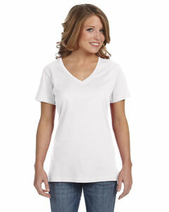 "3.2 oz., preshrunk 100% ringspun cotton; 40 singles; Heathers-60/40 poly/combed ringspun cotton; Heather Grey - 90/10 combed ringspun cotton/poly; single-needle seamed collar; mitered V-neck collar; double-needle stitching on sleeves and bottom hem; Oeko-Tex® Standard 100 Certified; features a TearAway label; semi-fitted contoured silhouette with sideseams and display tape;"