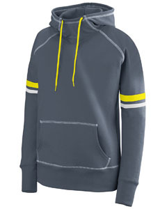 9 oz., 50% cotton, 50% polyester smooth athletic fleece; Ladies' fit; Raglan sleeves with two-color contrast stripes and thumbholes for warmth; Contrast-color drawcord in scuba shaped hood on sizes M-2XL only; Contrast-color three-needle coverstitching; Front pouch pocket; 1x1 rib-knit cuffs and bottom band;