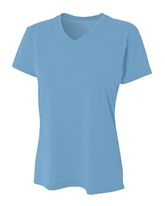 100% polyester heather tee, 4.2 oz. per square yard; Moisture management for all season comfort; Odor resistant and stain release fabric for easy care; Double needle cover-stitch hem; Reinforced shoulder seam; Tag free v-neck;