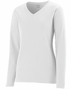 100% polyester wicking knit; Moisture wicking; Pad print label; Self-fabric V-neck collar; Set-in sleeves; Double-needle hemmed set-in sleeves and bottom; Ladies Fit ;