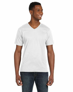 "4.5 oz., preshrunk 100% combed ringspun cotton; 30 singles; features a TearAway label; double-needle sleeve and bottom hem; Oeko-Tex® Standard 100 Certified; tubular construction; Heather Grey is 90/10 cotton/poly; Heather colors are 60/40 poly/cotton; semi-fitted; shoulder-to-shoulder tape; seamed collar; mitered V-neck collar;"