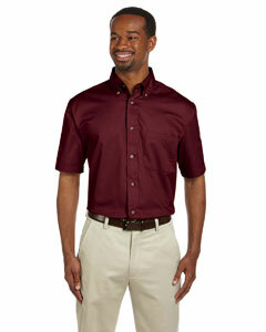 "55% cotton, 45% polyester twill with stain-release; Wrinkle-resistant; Extra stitching at seams and buttons; Flat-felled seam finishing; Signature horn-style buttons with Harriton logo; Hemmed short-sleeves; Button-down collar; Left-chest pocket; Full back yoke and back pleat;"
