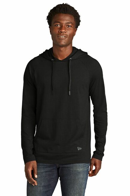 An exceptional layering piece this hoodie has softness moisture-wicking performance and modern design. 4-ounce 55/34/11 cotton/polyester/rayon 32 singles 3-panel hoodHeat transfer label for tag-free comfortFlat drawcords with silicone dipped endsFront pouch pocketHeat transfer New Era flag logo on lower left pocket