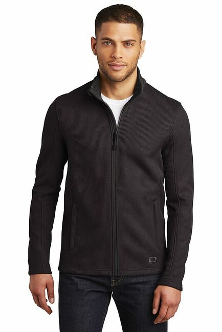 With a unique and rugged texture this jacket shows real grit. Heavy gauge knit an embossed lining and understated details give it a sharp take on utility and comfort. 19.9-ounce 100% poly knit bonded to 100% poly brushed-back fleece Zip-through cadet collar OGIO heat transfer label for tag-free comfort OGIO locker loop Embossed lining with subtle O pattern Reverse coil zipper with OGIO zipper pull Embroidered O on front and back Open cuffs and hem