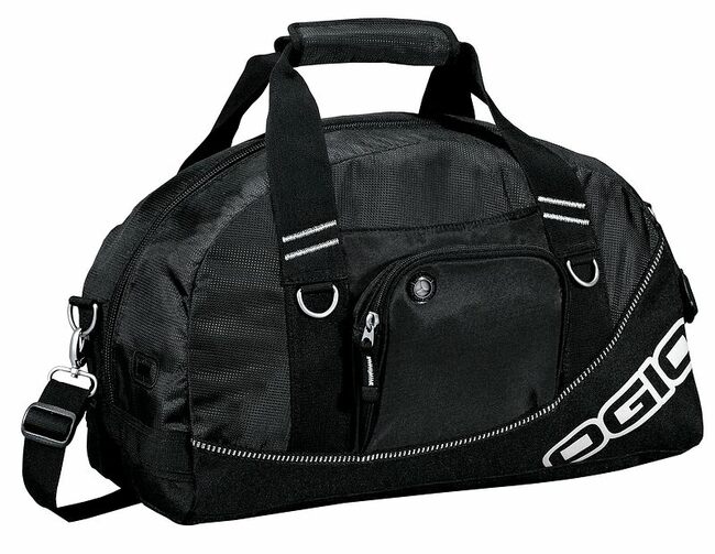 Sized to fit the gym locker this duffel opens wide to reveal a roomy interior that holds shoes and a change of clothes.600D poly/420D dobby poly Front zippered digital media/audio pocket with headphone exit port Easy-access front sleeve pocket Detachable adjustable shoulder strap Side grab handle Fabric-wrapped handle Dimensions: 10 h x 18 w x 9 d Capacity: 1 800 cu.in./29.5L Weight: 1.0 lbs./0.5kg Note: Bags not intended for use by children 12 and under. Includes a California Prop65 hangtag.