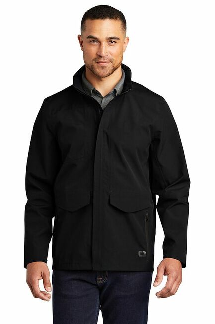 This parka-length fully seam-sealed jacket is sleek modern and can take on most forecasts with 5K/5K weather protection. Durable water-repellent (DWR) 100% poly shell bonded to a water-resistant film insert for wind and water resistance 5000MM fabric waterproof rating 5000G/M2 fabric breathability rating Adjustable packable hood Mitered OGIO back neck label Exterior storm flap Waterproof molded zippers Black reflective taping details Patch pockets Adjustable snap-closure cuffs Black reflective O heat transfer on front left hem
