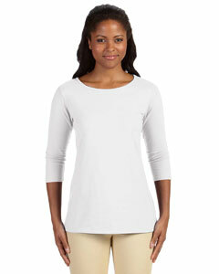 "5 oz., 58% cotton, 39% modal, 3% spandex jersey; Soft modal blend drapes without clinging; Always flattering Perfect Fit™; Ballet neckline; New bracelet length sleeve ends right where you want it; Delicate shaping at waist; Longer 26"" length (size medium);"