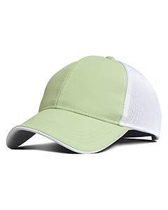 Lined nylon mesh back panels; Pearl nylon with UPF 50 sun protection front panels; Contrasting visor tip & under visor; Moisture wicking sweatband; Pro stitching; Structured stiff buckram mid-profile; Pewter dye cut buckle & grommet closure;
