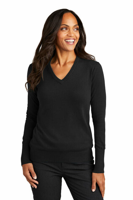 A beautiful and versatile addition to any work wardrobe our fine-gauge v-neck sweater has fully-fashioned sleeves for strength comfort and longer wear. 60/40 cotton/nylon Rib knit v-neck cuffs and hem Longer rib knit height at cuffs for character