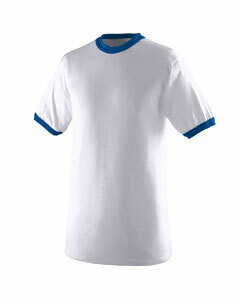 "5.2 oz., 50% polyester/50% cotton jersey; Contrasting color 1x1 rib-knit collar and cuffs; Double-needle hemmed bottom;"
