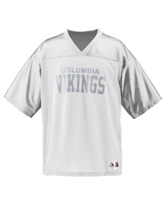 "3.4 oz., 100% polyester tricot mesh ; 100% polyester dazzle fabric yoke and sleeves; 1x1 rib-knit modified V-neck collar; Front and back yoke large enough for embellishment; Set-in sleeves; Outside locker label with size on left side near bottom hem; Double-needle hemmed sleeves and bottom;"