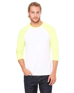 "3.6 oz., 52% combed and ringspun cotton, 48% polyester; 40 singles; Triblends - 50% poly, 25% combed ringspun cotton, 25% rayon, 40 singles, 3.8 oz.; Marble colors are 91% polyester, 9% combed ringspun cotton, 30 singles, 4 oz.; Neon colors are 52% combed ringspun cotton, 48% polyester, 40 singles, 3.6 oz.; contrast raglan sleeves and neck trim; sideseamed; unisex sizing; retail fit;"