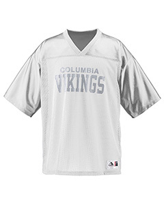 "3.4 oz., 100% polyester tricot mesh; 100% polyester dazzle fabric yoke and sleeves; 1x1 rib-knit modified V-neck collar; Front and back yoke large enough for embellishment; Set-in sleeves; Double-needle hemmed sleeves and bottom; Outside locker label is on wearer's left side near bottom hem; Not meant to be worn with pads;"