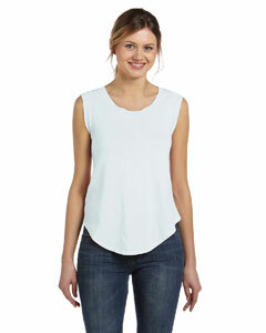 "40's 100% cotton jersey; 3.5 oz.; ladies' contemporary fit; colors are piece-dyed and garment-washed for superior softness; finished with double-needle stitching and a rounded bottom hem; Heather Grey is 67% cotton, 33% polyester;"